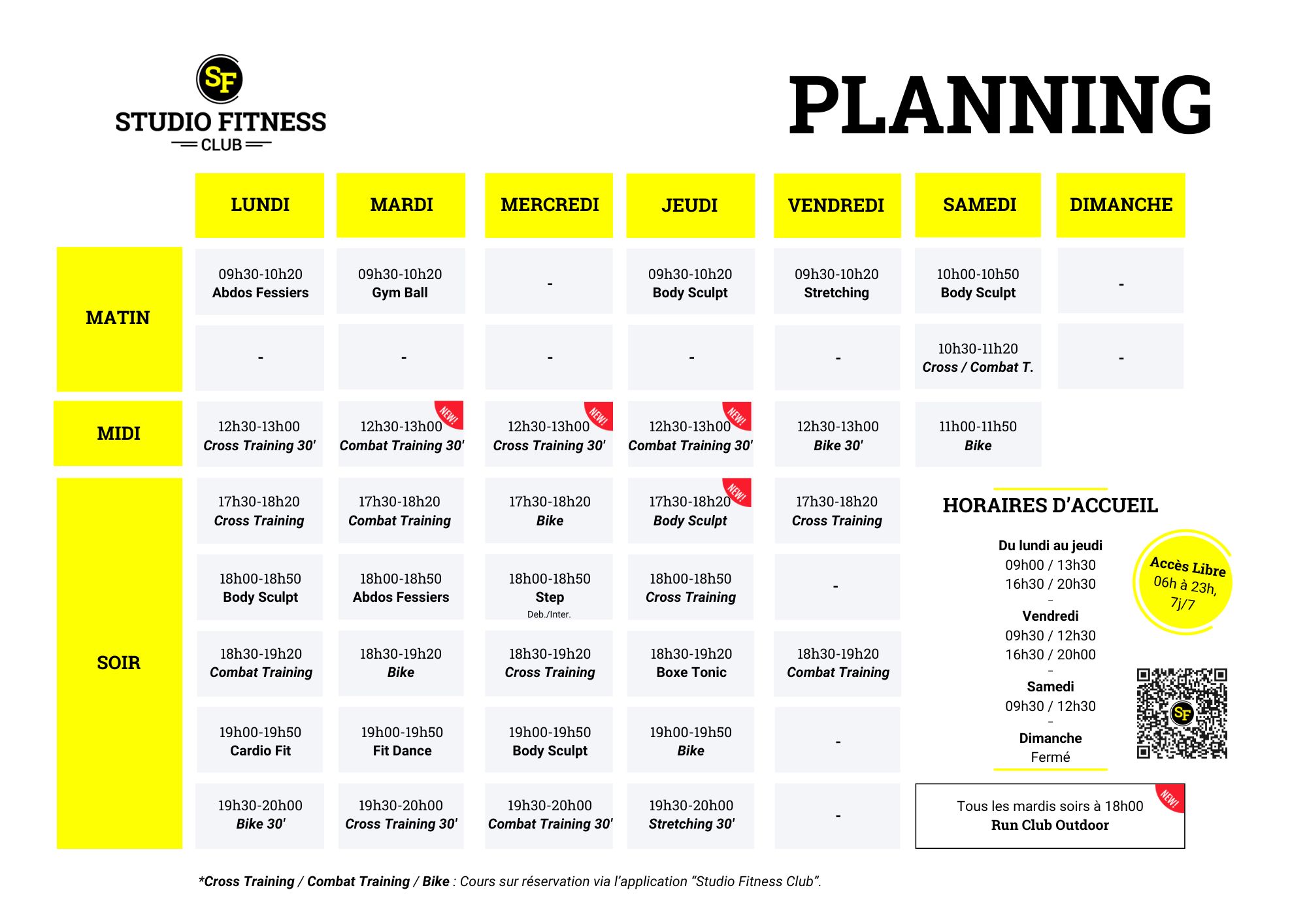 Notre salle de remise en forme propose un planning varié et dynamique pour répondre à tous les besoins et préférences de nos membres. Que vous soyez un adepte du cardio, de la musculation ou de l’entraînement en groupe, notre planning est conçu pour vous offrir une expérience complète et enrichissante.